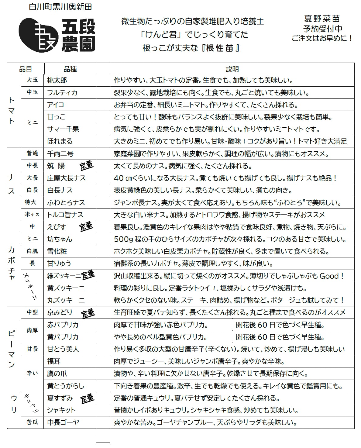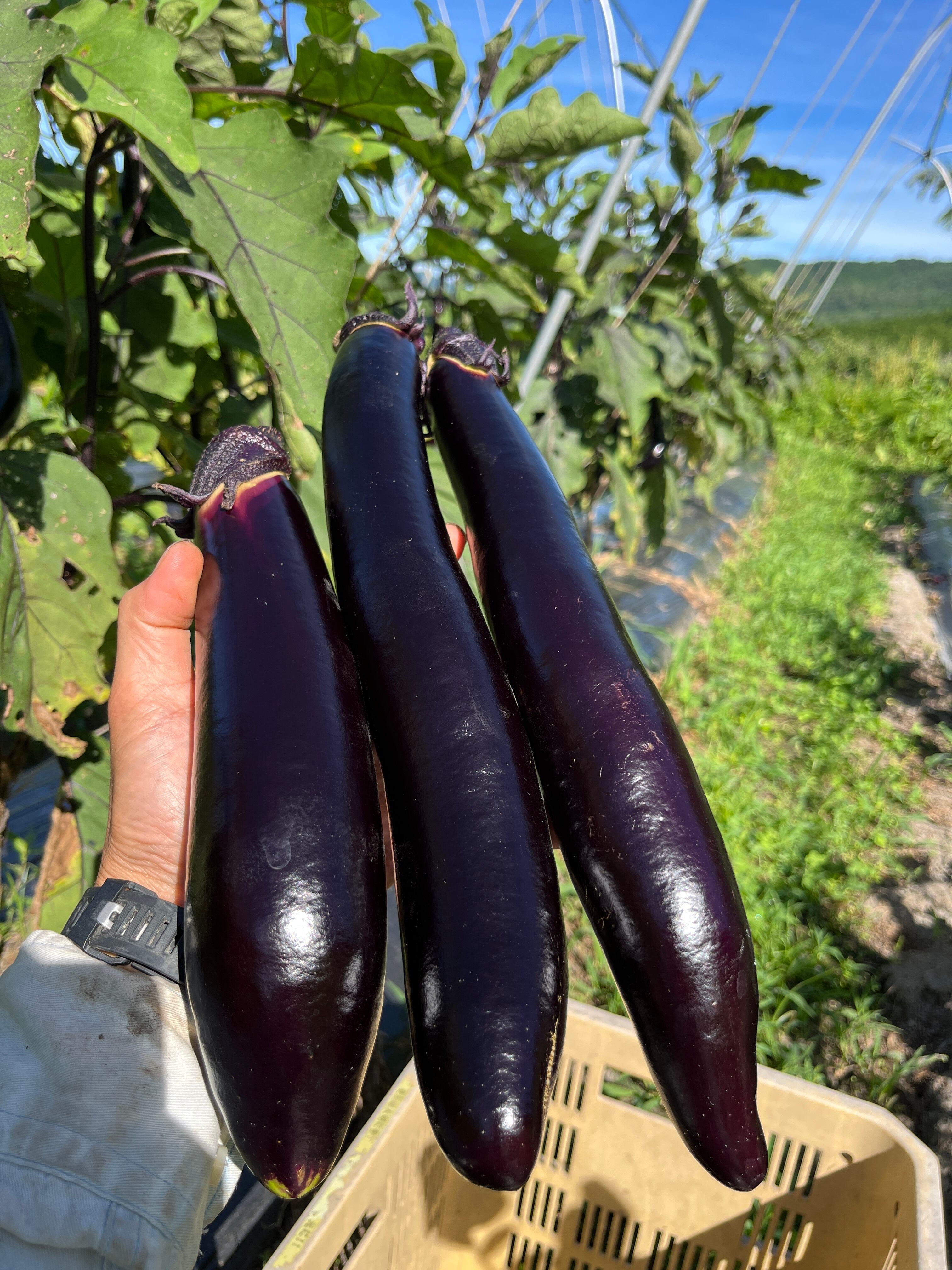 ナス:千両二号、筑陽、庄屋大長、白長、白い米ナス、ふわトロナス